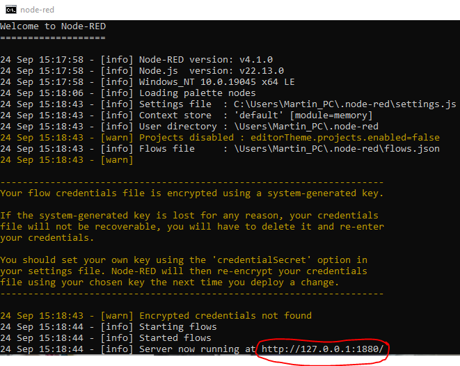 The most used is node.js with its npm command (package manager) we can install Node-RED into the operating system as a global module. The command for installing node-red: npm install -g --unsafe-perm node-red. (If you are using Linux, do not forget to sudo before the command). You can then run the installed Node-RED (version 4.1.0) via the command line (CMD) by entering the node-red command. The server will start on the localhost callback (127.0.0.1) and port 1880. The Node-RED environment is available through a browser.