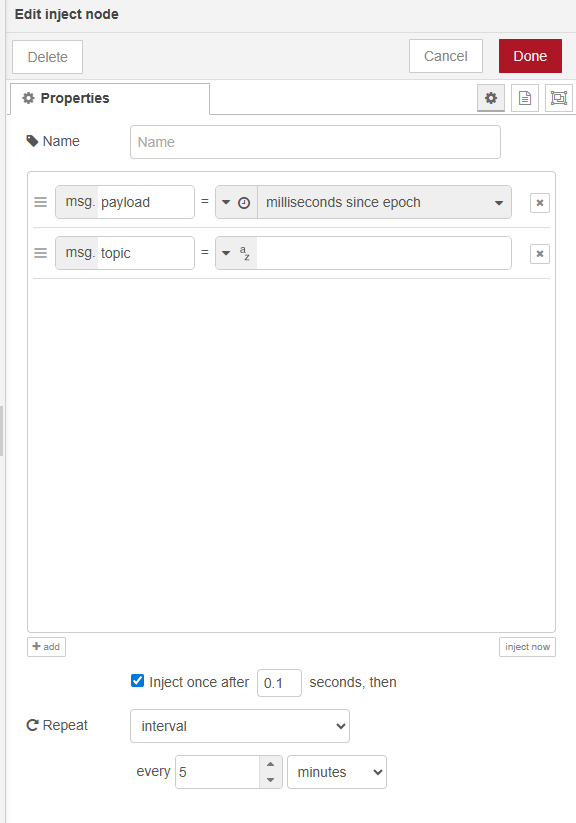 We will leave the Inject node in a predefined state, where it sends the number of milliseconds since the epoch (Unix timestamp) in msg.payload. At the bottom, we will adjust the interval to 5 minutes and we can also activate inject once after 0.1 seconds. This setting will allow inject to be run even after the application is deployed and we do not have to wait 5 minutes for the first iteration to run.