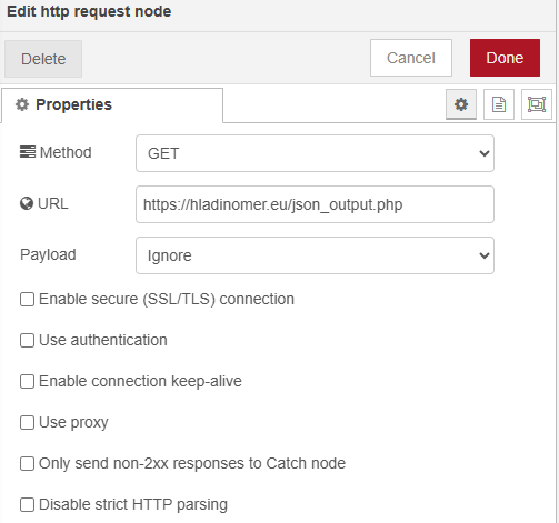 The second block will be the network node http request. After clicking on it, we will enter the HTTP method GET, the URL of the Watmonitor instance and its JSON endpoint. The request will be run every time a message arrives from the Inject node, i.e. once every 5 minutes. The request will be executed, the server response (payload) will be obtained and forwarded.