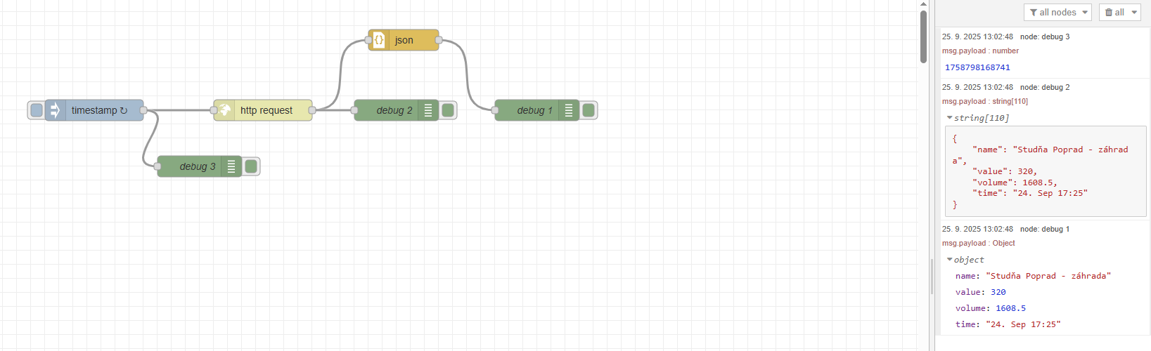 To know what each node is doing, and how it affects the payload, or rather what it sends to the next node, you can also add debug nodes to the flow. These allow us to get a better view of what is happening. In the right part, we can select the Debug section, which will list what is happening in the given flow. A flow built in this way gives us the basic functionality of periodic running, obtaining data and parsing it into a JSON object, which we can work with further.