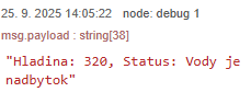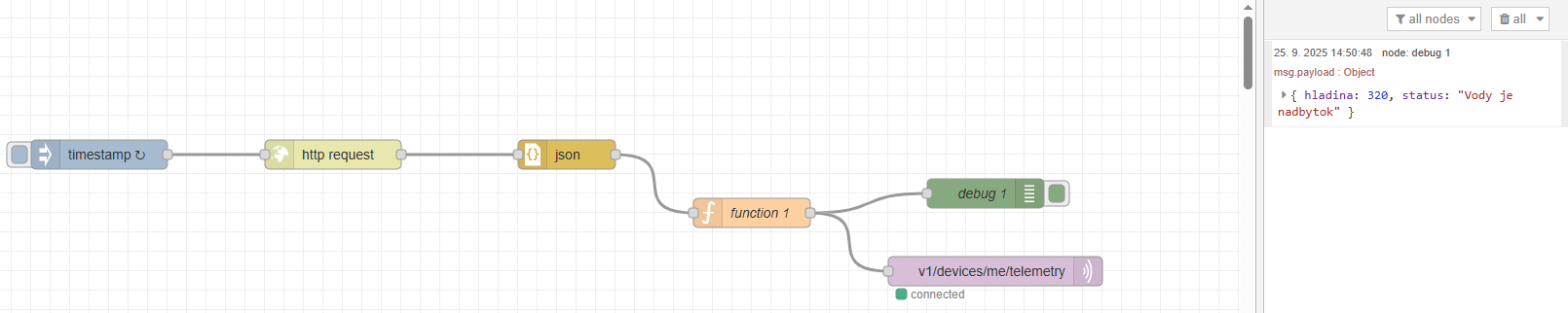 In a similar way, it is possible to use the http request node, which can write data to ThingsBoard via REST API, but it can also be used for other actions such as launching webhooks (IFTTT, Zapier, n8n and the like), which can bring an interesting and fast way of informing the user about actions that have occurred in Watmonitor. You can easily extend Node-RED like an octopus.