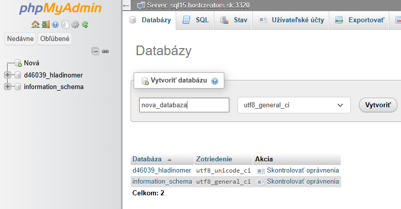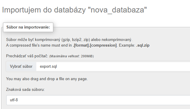 After clicking on the created database, go to Import from the top menu. Make sure you are in the correct database, which you can also see in the text Importing to database, with the current database selected in quotes. Select the export.sql file with the table structure, which is part of the Watmonitor archive in the sql folder. After a successful import, a table named "studna2" will be created under the given database.